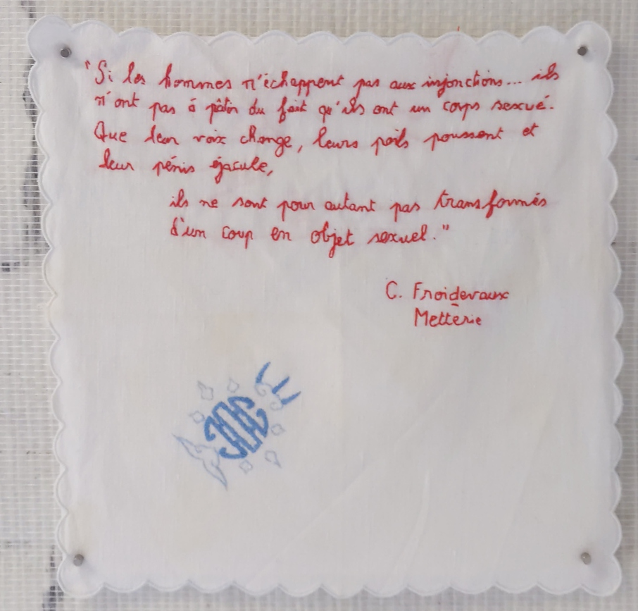 Série brodée sur les mouchoirs monogrammés par feu Mme Le Goff née au premier quart du siècle dernier. Un héritage familial en rupture, acquis sur une brocante du sud de la France et qui devient un nouvel objet de transmission des voix qui m’importent et me portent.